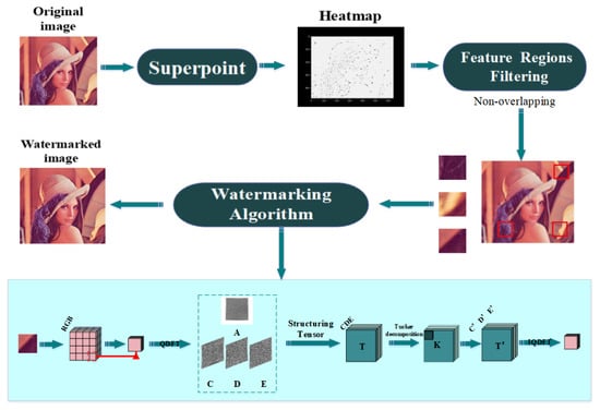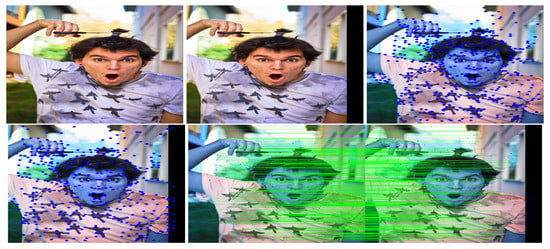 Local feature keypoints have been widely employed in robust image watermarking for localization preprocessing. Existing keypoint detection methods mainly include the following types: SIFT [,,], SURF [,], Harris [,], BRISK [], FAST [], BRIEF [] and ORB []. Over the past few years, keypoint detection methods based on the applicability and potential of machine learning, particularly deep learning, have superseded these traditional approaches [,,,,,,,,]. Yi et al. [] proposed a deep-learning framework based on a conventional neural network to detect feature points, direction estimation, and descriptor extraction. Verdie et al. [] proposed a keypoint detection algorithm based on learning that can deal well with the changes of different scenes. Daniel et al. [] proposed a FCNN model for keypoint detection and descriptor generation based on SuperPoint self-supervised optimization. Liu et al. [] introduced a scheme descriptor generation dubbed GIFT based on group of transformations network. Yuki et al. [] introduced a novel deep model that learns local features by a local feature pipeline and does not require human supervision.