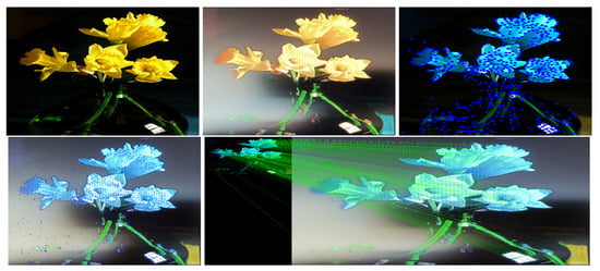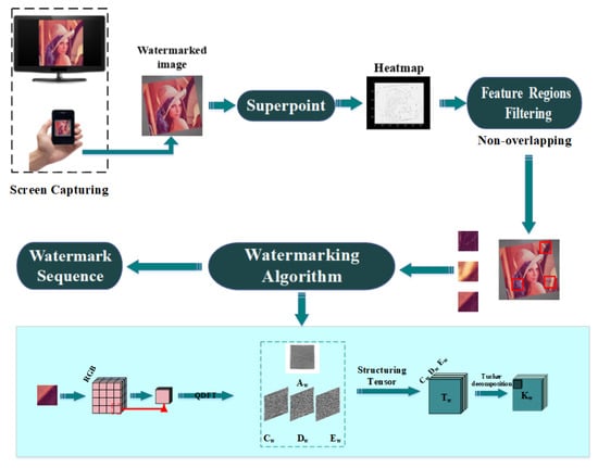 Frequency-domain watermarking technology, such as DWT [], DFT [], DCT [], QDFT [,] and tensor decomposition [,,], helps improve imperceptibility and robustness. For instance, Fang et al. [] proposed an intensity-based SIFT algorithm to extract complete watermark information from the screen image to protect confidential information in the DCT domain. However, SIFT keypoints are not consistent and stable under screen-shooting attacks. Lorenzo et al. [] improved a strategy for watermarking on color images by using a mobile phone based on the Neyman–Pearson criterion. Fang et al. [] proposed a screen-to-camera image code named “TERA”, which can be widely used in many applications for copyright protection by using a leak-tracing watermark. Fang et al. [] designed a novel document underpainting watermarking algorithm resilient to camera-shooting.