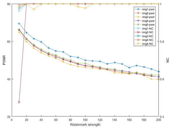 PSNR and NC of the five watermarked images with different watermark strengths.