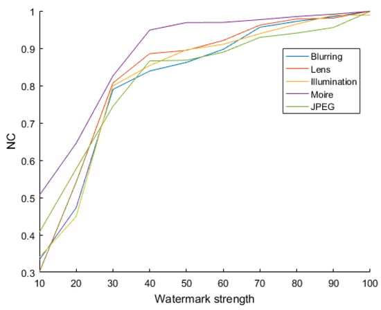 Figure 7 shows the NC after several shooting attacks, consisting of “blur”, “lens”, “illumination”, “moiré”, and “JPEG”. When the images are under attack, the watermark can be extracted by our algorithm, and the NC converges down toward 1.