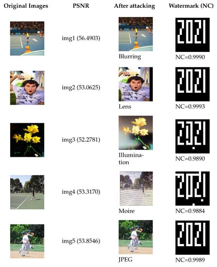 To illustrate the performance of the watermarking algorithm, this study used the peak signal to noise ratio [], and a normalized correlation coefficient [,] to evaluate the visibility and robustness of the watermarking scheme. was used to describe the fidelity performance, and was used to describe the watermarking robustness.