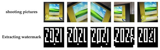 We analyzed the robust algorithm against screen-shooting attacks and scaling within a reasonable range. The original image was a , screen capture, and the captured image was 4032 × 3024. As we saw, the captured image was approximately six times larger, so we reduced it six times. Beyond that, the proposed watermarking algorithm was a small size for accuracy of extraction, and we embedded complete watermark information repeatedly to ensure that at least one watermark survived distortion.