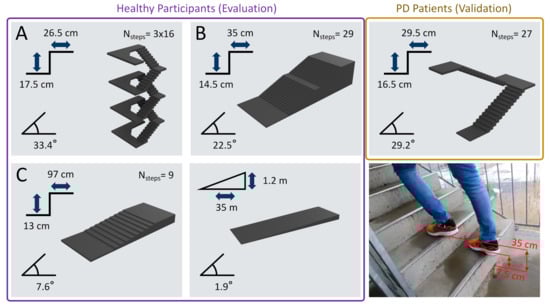 Illustration of the different stair configurations within the presented dataset, including the respective step geometries. (A) staircase over four floors including 90 turns; (B) straight staircase; (C) flat staircase with elongated landings.