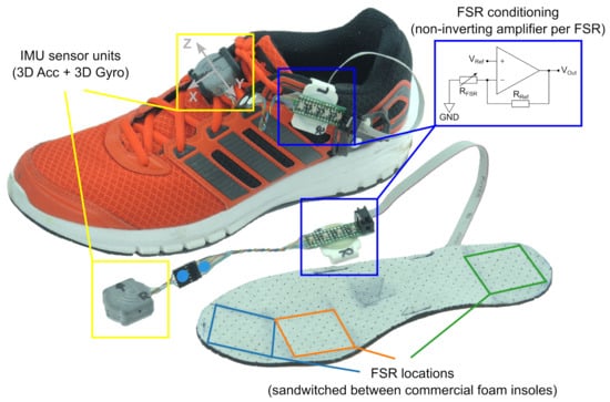The IMU sensor units (Portabiles GmbH, Erlangen, Germany) featured a 3D accelerometer (range ± 16 ), a 3D gyroscope (range ±2000 degree per second (dps)) (BMI160, Bosch Sensortec GmbH, Reutlingen, Germany) with Bluetooth Low Energy connectivity, and an internal flash memory for stand-alone operation. Data were recorded with a sampling frequency of . IMU sensors were calibrated prior to the recordings using the method described by Ferraris et al. [31]. To enable an additional reference for foot ground contact, a custom force-sensitive resistor (FSR)-based insole and signal-conditioning circuit (non-inverting amplifier) were developed, which were connected via an extension ribbon cable to an available three-channel, 16-bit analog-to-digital converter (ADC) of the sensor units. Two sensor units were attached to the left and right shoe instep position using 3D-printed clips, while the insole conditioning circuit was fixed via a second clip on the lateral side of each shoe (see Figure 2). As an additional reference, all gait sequences were filmed during the study with a hand-held video camera by the study coordinator, with the permission of each participant.