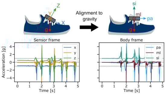 Due to the attachment of the sensor to the shoe’s instep position, a rough alignment between sensor and shoe was given. However, to ensure a constant alignment between the sensor and the body coordinate system, across participants and datasets or even between studies, a coordinate transformation of the recorded IMU data was performed, as illustrated in Figure 3. To enable a comparable sensor orientation, the sensor coordinate system was aligned to the gravity vector direction for each gait sequence. Therefore, the orientation of the sensor with respect to gravity was estimated by averaging all acceleration vectors during static periods . Static sequences between walking bouts (where participants were standing before the first or after the last stride) were defined as windows of minimum 1 where the angular velocity of the foot was below . The rotation vector for the sensor-to-gravity alignment was defined by the rotation angle around the vector :