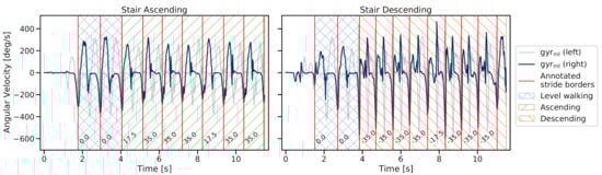 Although stair ascending and descending strides follow similar repetitive swing- and stance phase patterns compared to level walking, the angular velocity within the mediolateral axis () follows inherently different and stride type-specific patterns (Figure 4), which corresponds to the foot’s flexion during the gait cycle. While ascending, participants tended to show a forefoot walking behaviour, sometimes with no heel contact at all. Likewise, while descending, the foot rolling behaviour was often missing, resulting in the initial contact with toes first or the complete flat foot [32]. Nevertheless, all three stride types showed a prominent negative peak in the axis, which refers to the foot lift or terminal contact (TC) [23]. This negative peak was used for manual stride border annotation (along with the video recordings of the feet), as suggested by previous literature [15,17,18]. To enable a consistent annotation process, the following criteria were applied: to ensure a stable minimum for the TC label, the negative peak had to have a minimum dip of , and a stride was only considered valid if the swing maximum was at least 50 .