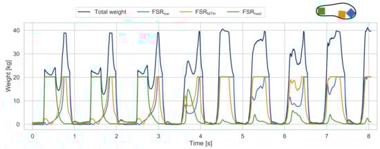 was fixed at and was selected individually for each FSR during a calibration procedure prior to the study. Therefore, each FSR was loaded from to 20 kg in steps, using a load cell as reference. Although the conditioning circuit improved the linearity of the FSR sensor output, an individual calibration function was added to the measured voltage signal, which corresponded to a 6th order polynomial fit across the 0– 20 calibration measurement.