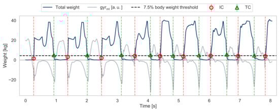 To remove baseline offsets within the pressure signal (e.g., due to the lacing of the shoes), the minimum pressure was subtracted from between the manually annotated stride borders. Finally, a threshold-based approach similar to [35] was applied to the total weight signal in order to define the time points of the reference IC and TC. For our work, an individual threshold of 7.5% of the participant’s body weight was chosen empirically, as shown in Figure 6.
