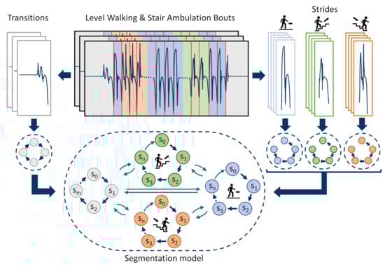 Together with the transition model, the final multiclass segmentation HMM was built from four individual trained sub-models: transition model, level walking stride model, stair ascending stride model, and stair descending stride model, as illustrated in Figure 7.