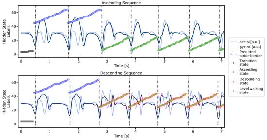 Predicted hidden-state sequence and extracted stride borders using the proposed multiclass HMM. For better visualisation, only the two input streams (raw data, downsampled and low-pass filtered) are displayed.