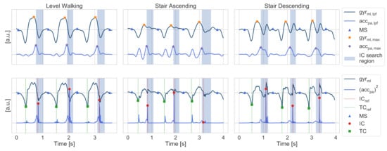 Although the sequence of events is the same for level walking and stair ambulation, event-detection algorithms—which were initially developed only for level-walking gait similar to the algorithms presented by Rampp et al. [37]—could not be directly applied to stair strides as those expect a present heel strike during IC, which is often missing during stair climbing. Therefore, existing event detection methods were adapted for the purpose of robust gait event detection, which also works during the absence of a heel strike and a first ground contact with toes or a flat foot.