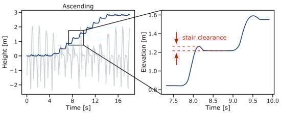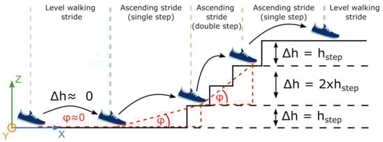 A simple but robust approach to differentiate between level walking, stair ascending, and descending constitutes the use of the trajectory features of a respective stride, as presented by Song et al. [28]. During stair ambulation, a stride should end with a positive or negative change in height for ascending or descending, respectively. During level walking, the change in height is expected to be roughly equal to zero between ground contact phases. Therefore, the change in the height of the stride is a prominent feature in the classification of stair strides. Furthermore, the travelled trajectory’s inclination is considered a second feature. The inclination incorporates the stride length, which is usually shorter for stair strides compared to level walking due to the constraints given by the geometry of the stairs, as illustrated for an ascending sequence in Figure 10.