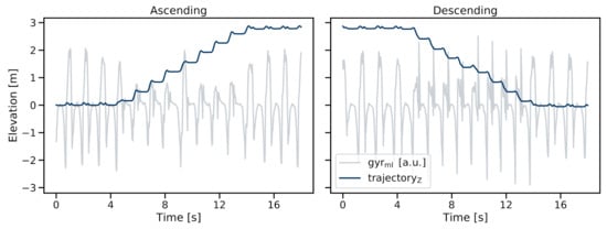 For each annotated stride, a stride-type label was added—level walking (which also included the ramp strides), stair ascending, or stair descending (Figure 4). Based on the video data, additional reference elevation levels were added that corresponded to the respective stair step height, which was known due to the specific stair configurations (Figure 1). During steady-state stair climbing, this value mostly corresponded to twice the stair step height. Therefore, these strides will be referred to as double stair step strides. During transitions between stair and level walking or on stair landings, single stair step height strides occurred, which will be referred to as single stair step strides. For level walking, the height difference was annotated to be zero, and for the ramp, a constant stride elevation of the ramp height divided by the number of ramp strides was assumed.