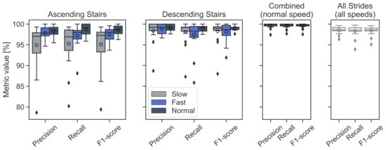 The first contribution of the proposed pipeline was the identification and segmentation of individual strides regardless of the underlying gait activity. Due to the changing foot rolling behaviour during stair ambulation, the segmentation methods developed purely for level walking strides were insufficient if stair sequences were included. Hence, an existing HMM [18] for real-world stride segmentation was extended to a multiclass HMM in order to also model respective stair ascending and descending strides. To enable the simultaneous detection of stride borders of different gait activities, individual sub-HMMs per stride type were trained using the annotated data and subsequently combined with the extended segmentation model. The proposed multiclass HMM achieved a promising segmentation performance, with an F1 score of % for the evaluation dataset. The worst F1 score of % was found during slow stair ascending where the characteristic TC peak for some participants was no longer clearly defined, and the evaluation criteria for valid stride borders were not met. Compared to previous studies [17,18,19] (which only included level walking gait during evaluation), our presented multiclass HMM segmentation approach reached slightly improved segmentation performance across multiple gait activities. One limitation of the presented study is certainly the lack of other cyclic activities, which might lead to falsely segmented strides. However, due to the subsequent pipeline steps, such FPs could be effectively rejected due to unrealistic temporal or spatial parameters.