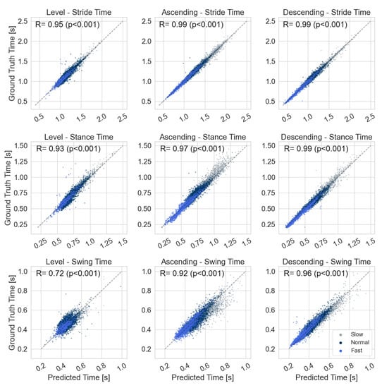 As a final step, the entire pipeline was validated end-to-end with respect to DMOs. This step is often overlooked but very important for future real-world analysis applications as reference labels are often missing; hence, retraining or optimizing parameters is difficult or impossible. Furthermore, single pipeline blocks usually depend on each other, which can lead to the propagation of errors but also to the possibility of being cancelled out by subsequent pipeline blocks. Therefore, only an end-to-end validation of all combined steps can capture the pipeline performance under realistic conditions. Especially for real-world studies, which come more and more into the focus of clinical gait analysis [10], application-driven pipelines that can robustly and automatically handle continuous input sequences without manual intervention are required. Respective output parameters in the form of objective and interpretable parameters could then be used to answer clinically relevant questions such as the assessment of a patient’s fall risk and disease state or progression. Because stair ambulation speed is primarily modulated by varying stance and swing times due to the constrained stair geometry (as illustrated in Figure 14), respective parameters were considered as primary DMOs for the final validation. The pipeline showed a good agreement of temporal stride parameters for both the healthy-participant evaluation dataset and the PD-patient validation dataset, with mean errors below 10 for average bout parameters as well as their standard deviation. The overall performance was comparable between both datasets and also proved the validity of the presented pipeline for elderly patients suffering neurological conditions such as PD. Although the presented results were promising, the respective datasets were collected under supervision following a predefined protocol and a limited number of individual patients. Therefore, the proposed pipeline will still need to prove its performance on unsupervised continuous real-world data in future studies, where changing environments, underground, or stair geometries, as well as unexpected movements and activities, might lower the accuracy of the extracted gait parameters. Finally, extracted real-world stair ambulation DMOs must undergo clinical validation and prove their applicability in supporting clinical questions such as the assessment of fall risk, disease state, or therapeutic effects.