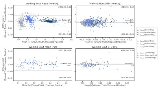 Overall, the pipeline was in good agreement with the ground truth reference (Figure 17), with a mean difference of parameters for the mean and the standard deviation of walking bouts below . The 95% limits of agreement were below ± for the evaluation dataset and only marginally higher with ± for the PD validation dataset. The results indicate good generalization and robustness of the proposed pipeline, with similar error ranges for both datasets and potential application on the data of patients with gait impairments, as in PD.