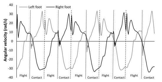 A typical example of five steps of the raw plantar flexion pattern measured with an IMU (Xsens system) attached on the left and right foot with corresponding contact and flight time phases.