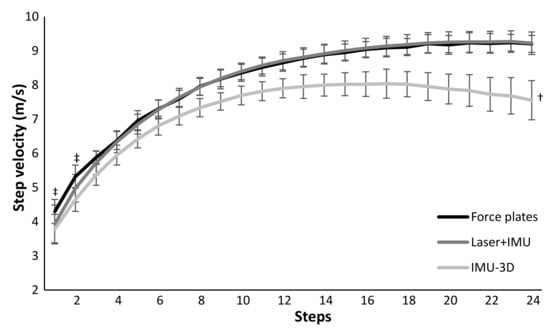 Mean (±SD) step-by-step velocity averaged over all participants during 50 m sprints measured with force plates, laser+IMU and IMU-3D based systems. † indicates a significant difference for each step for this condition with the force plate condition on a p < 0.05 level. ‡ indicates a significant difference for this step for laser+IMU system with the force plate condition on a p < 0.05 level.