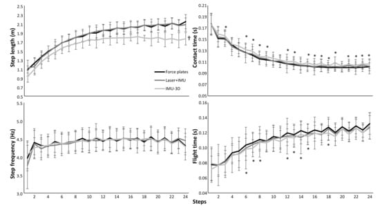 A significant effect of steps was found for all five kinematic variables (F ≥ 6.3, p ≤ 0.001, η2 ≥ 0.33). Also, a significant effect between the three measurement systems was found for step velocity (F = 76, p ≤ 0.001, η2 = 0.86), step length (F = 34, p ≤ 0.001, η2 = 0.72) and contact times (F = 11, p ≤ 0.001, η2 = 0.46) and a significant step*system interaction effect of these three kinematical variables was found (F ≥ 1.4, p ≤ 0.049, η2 ≥ 0.10). For step frequency and flight time no significant measurement system or interaction effects were found (F ≤ 2.3, p ≥ 0.134, η2 ≤ 0.15). Post hoc comparison showed that step velocity and step length measured with the IMU-3D system were lower in each step and followed another development trajectory over the 24 steps compared to that measured with force plates (Figure 2 and Figure 3). In addition, contact times, in most steps, were longer (16 steps) and flight times were shorter (9 steps) when measured with the IMU-3D system compared to force plates (Figure 3). There were no significant differences found between the laser+IMU system and the force plate system for any of the kinematics (Figure 2 and Figure 3), except when evaluating per step; in the first two steps, a significant lower step velocity was found in the laser+IMU system compared with the force plates.