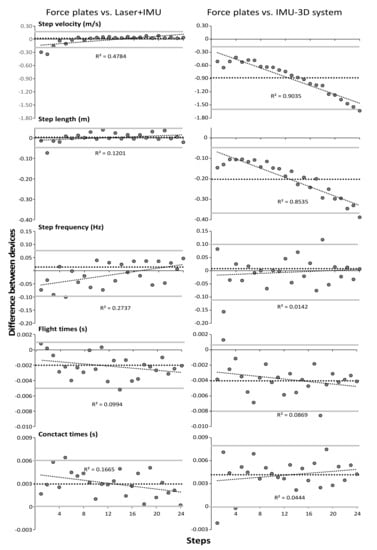 A significant systematic bias over all steps in step velocity (−0.88 m/s) and step length (−0.20 m) between the IMU-3D system and force plates was found in which the step velocity and step length were measured slower and shorter in the IMU-3D system compared with force plates (Figure 4). In addition, the average contact times over all steps were significantly longer (0.003 and 0.004 s) and flight times were shorter (−0.002 and −0.004 s) when measured with the laser+IMU and IMU-3D system compared to force plates (Figure 4). However, when analyzing per step, this was mostly only shown in the IMU-3D system compared with force plates (Figure 3). Furthermore, some significant, moderate to nearly perfect correlations were found between steps and difference in measurement between the systems with force plates (Figure 4). Practically perfect, negative correlations were found in step velocity (r = −0.95) and length (−0.92), and trivial for the other parameters (−0.29 < r < 0.21) between IMU-3D and force plate measurements, while significant, high, positive correlations were found in step velocity (r = 0.69) and step frequency (0.53), moderate in step length (0.35) and contact times (−0.36), and trivial for flight time (−0.23) between laser+IMU and force plate measurements (Figure 4).