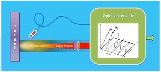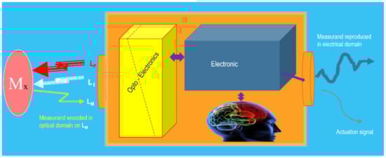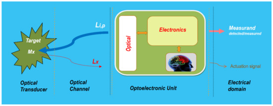 On the other hand, another essential part of an actual photonic sensor is the optoelectronic unit (OU). This unit is in charge of generating the appropriate lights (if required) to carry out the object’s interrogation or/and pumping tasks. It is also in charge of achieving adequate photodetection, pre-amplification, demodulation, and additional (if required) tasks such as equalization, digitalizing, processing, etc., to reproduce, with the pre-specified quality, the measurand in the electrical domain (Figure 3).