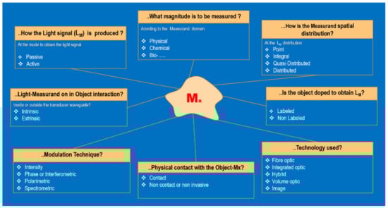 As shown in Figure 5, considering aspects concerning the measurand (Mx) and the modulated light (LM), different blocks of knowledge to define each photonic sensor can be obtained.