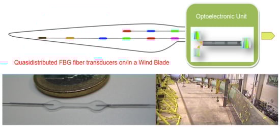 As electric utility wind turbines increase in size, and correspondingly, increase in initial capital investment cost, there is an increasing need to monitor the structure’s health. Acquiring an early indication of structural or mechanical problems allows operators to better plan for maintenance, possibly operate the machine in a de-rated condition rather than taking the unit off-line, or in the case of an emergency, shut the machine down to avoid further damage. To build an accurate Structural Health Monitoring (SHM) system in the wind turbine, photonic sensors based on fiber technology installed on/in the blades are essential [41,42,43,44,45,46,47,48,49,50,51,52,53,54,55]. Even though several fiber optic transducer technologies are being employed to constitute the “nerve” part of the smart fiber optic sensor system, here, we will only briefly mention one based on FBGs (Figure 8).
