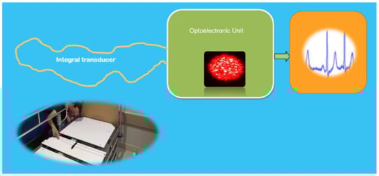With this in mind, to detect vital signs of patients lying on/in bed, an integral speckle-based optical fiber sensor has been conceived, developed, checked in the laboratory, and is being validated in field conditions. As shown in Figure 9, the integral transducer is constituted by an appropriate multimode Polymer Optical Fiber (POF). The semiconductor laser source beam (638-nm wavelength) is launched into the transducer fiber. The speckle pattern at its end is detected by a very tiny, low-cost CCD camera that produces data at an appropriate rate (frames per second). As the changes in the intensity of successive speckle frames are dependent on the fiber perturbation, a one-dimensional and time-dependent intensity change signal that summarizes all the speckle perturbation information is generated. Appropriated further processing converts the intensity of the speckle signal into a time-dependent HR signal. It is worth mentioning that this transformation has to take place in near real-time conditions (inline processing), transforming the perturbation value into HR value and motion detection [62]. Currently, this patented [63] fiber-based photonic sensor developed in the frame of the TeDFES (European funds) is being validated in several services of two hospitals of the SCS in Santander, Spain.