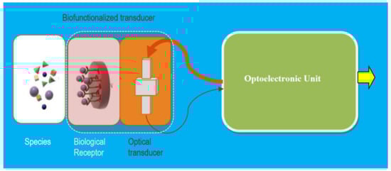 A general schematic illustration of a BioPhotonic Sensor: The bio-functionalized transducer is constituted by a specific biological receptor on the right part of an optical transducer; only the specific bio-species (Mx) will be placed on the particular receptor changing (modulating) the optical properties on the optical transducer response. These changes are detected and correlated with the Mx and, after the proper processing, the output is given by the optoelectronic unit. If some kind of specific intelligence is added, then an actuation signal could be offered at the OU’s output. The optical transducer can be implemented using different technologies, being more valuable than the integrated optics one. Courtesy of the author.