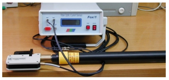 Advantages of OCTs in the monitoring of power systems are also significant [5,67]. Since the FE response time is in the range of ns or less, the frequency range is practically limited by the optoelectronic conversion block. Owing to its wide frequency bandwidth, an OCT is able to detect transient electrical faults in power systems [68,69,70]. Light is the carrier of information so, in contrast to metallic wires, electromagnetic induction is not a problem, which is also important in power systems [71]. Sensors can be designed small, portable, safe and easy to operate and maintain. With an extrinsic OCT output, an OF carries the information on the current in the form of intensity-modulated light, and WDM can be used to carry this information through the same OF used for other FOSs in the system (for example, FBG used for temperature monitoring). Unlike current transformers, extrinsic OCTs can be applied without interruption of the power supply. High electric insulation is mentioned in almost every paper introduction, and instead of referencing these we will display, in Figure 1, the measurement head, mounted on an insulating rod certified to operate up to a 100 kV voltage level.