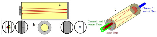Figure 4. Measuring head that provides 2 channels (green) for the implementation of normalization, and the third channel (blue) for temperature compensation by OA measurement. (a) Longitudinal cross-section, (b) transversal cross-sections and (c) schematic diagram.