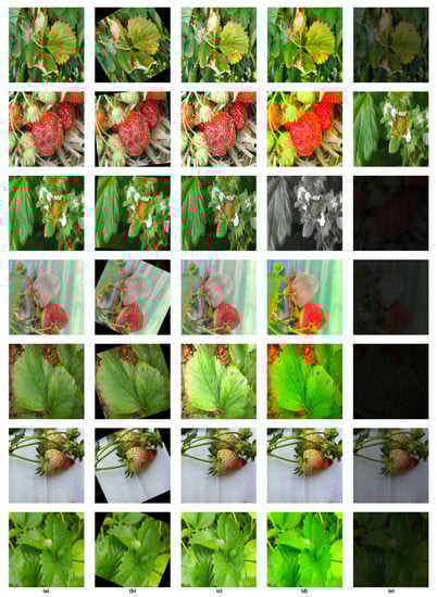 The dataset contains 2500 images for strawberry diseases collected from various greenhouses using camera-equipped mobile phones. The data was collected from multiple greenhouses under natural illumination conditions in South Korea to ensure a diversity of environmental factors. The diseases were verified by experts in the field. Note that approximately 20% of the images contained in the dataset were collected from online sources (Università di Bologna, Bugwood.org (accessed on 22 July 2021); Ontario Ministry of Agriculture, Food and Rural Affairs (OMAFRA); Nicole Ward Gauthier, University of Kentucky; Gerald Holmes, Strawberry Center, Cal Poly San Luis Obispo, Bugwood.org; William W. Turechek USDA ARS; Frank J. Louws, NC State University; Steven Koike, Plant Pathology Farm Advisor, University of California Agriculture and Natural resources blogs; Garrett Ridge, NC State University; Cornell University; College of Agriculture and Life Science blogs; Madeline Dowling, phytographics.com (accessed on 22 July 2021); Jonas Janner Hamann, Universidade Federal de Santa Maria (UFSM), Bugwood.org; Clemson University—USDA Cooperative Extension Slide Series, Bugwood.org; University of Georgia Plant Pathology, University of Georgia, Bugwood.org; Paul Bachi, University of Kentucky Research and Education Center, Bugwood.org; Scott Bauer, USDA Agricultural Research Service, Bugwood.org; John Hartman, University of Kentucky, Bugwood.org; more details in dataset.txt.) [,,,,,]. The images in the dataset are processed to be of resolution 419 × 419. With regards to imaging distance, the dataset provides both close-up and distant views of the diseases. The dataset is composed of seven different types of strawberry diseases, with images ranging from initial, middle and final stages of the diseases. An example case for all seven strawberry diseases is visualized in Figure 2. The dataset is split into 1450, 307 and 743 images for training, validation and test sets, respectively. Table 4 provides a brief summary of our dataset. Online augmentation methods are used and as a result, the final number of images depends on the number of epochs the model is trained on the dataset. The image augmentation used here is described in more detail in Section 4. The dataset will be made publicly available for further experimentation.