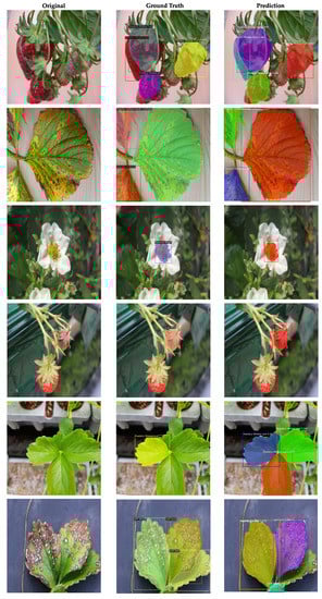 In Table 11, we compare results reported on other similar datasets. In their work, Ouyang et al. [] performed basic segmentation for three kinds of strawberry diseases. The diseased strawberry fruit is first extracted using digital image processing and pattern recognition techniques, and then a comparison is made for the recognition and classification results of a neural network with SVM. No official accuracy is reported; rather, it is concluded that SVM has a higher recognition rate than the neural network when used as a classifier. Next, the dataset of Byoungjun et al. [] report a basic mAP of 83.13% using Faster R-CNN with pre-trained ImageNet weights. Improvement is made using a cascaded architecture and pre-trained weights from PlantCLEF dataset. However, their dataset and thus the model is designed to perform coarse-grained object detection compared to fine-grained instance segmentation in this work. It is hoped that our model has the potential to match their final accuracy if a similar cascaded structure is employed, which we intend to explore as part of our future work.