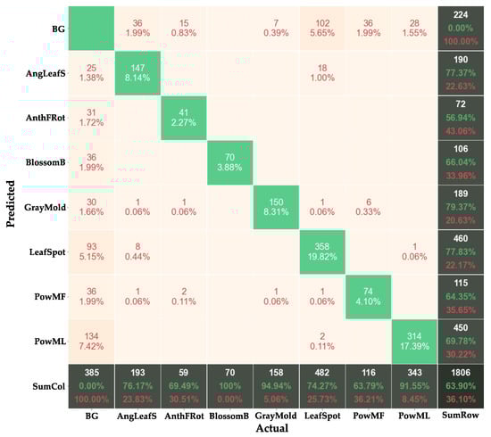 We visualize some of the final predicted masks by our model in Figure 6. Examples for both satisfactory predictions along with some misclassifications are presented. In Figure 7, we plot the confusion matrix for our final ResNet101 model to visually evaluate the performance of the detector. The matrix allows us to determine at what classes and features the neurons in the network mostly activate on. This enables us to identify inter-class confusions and to design rectifying procedures for the future. The x-axis in the matrix represents the ground truth class for each image, whereas the predictions done by the model on those images are shown on the y-axis. For instance, out of 158 instances of Gray Mold from the ground truth, 150 have been correctly detected by the model which is equivalent to 8.31% of the total predictions made by the model, while the model misclassifies 1 and 7 instances for Powdery Mildew Fruit and Background, respectively. To expand, the numbers on the edges denote the row and column-wise sum. For Gray Mold, the row and column-wise sum is 189 and 158, respectively. For the y-axis edge, 150 predicted True positives is equivalent to 79.37% of the total 189 Gray Mold predictions done by the network, leaving 20.63% as the error in this case. On the other hand, for the x-axis edge, out of total 158 Ground Truths objects for Gray Mold, 94.94%, or in other words, 150, have been correctly classified, leaving behind 5.06% or 8 as misclassifications. The bottom-right block is the sum of the row and column-wise totals, leading to a final value of 1806 objects. The sum of the True Positives is 1154, which equates to 63.90% of the total 1806 predictions.