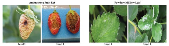 Examples for the diseases present in Level 1 and Level 2 for Anthracnose Fruit Rot and Powdery Mildew Leaf.