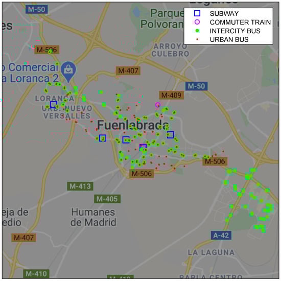 The public transport network in Fuenlabrada integrates 4 different modes: Subway (5 stops), Commuter Train (2), Urban Buses (275) and Intercity Bus to the capital city and other municipalities (414), which include 696 stops in total (
