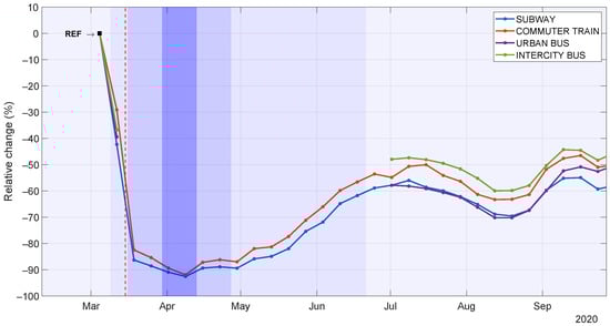 Figure 5 illustrates the weekly relative change in the daily number of validations per transport mode relative to the baseline level. We observe that all transport modes show a similar decrease, with several relevant peculiarities. First, the commuter train (red) exhibits the lowest drop during the state-of-alarm stage, which reflects a more pronounced dependency of travelers on this transport mode maybe due to a lack of other long-distance transport alternatives. In fact, we observe a similar behavior in intercity bus (green) during the post-state-of-alarm phase. Once the “new normality” phase started (late September), subway (blue) showed the lowest recovery among public transport modes, indicating that travelers continued perceiving it as a potential risk due to its limited ventilation.