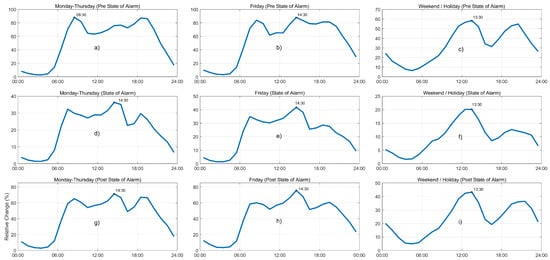 Figure 6c,i, respectively, are rather comparable, with their maximums at 13:00. On the other hand, during the hardest times of the lockdown period,