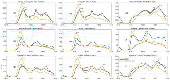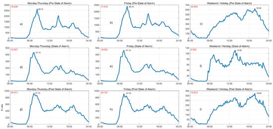 Figure 8d, we can observe that the subway’s morning peak appears an hour before its usual time in the pre-state-of-alarm period, while the mid-day peaks reduces its level. During the post-state-of-alarm phase (blue curve in