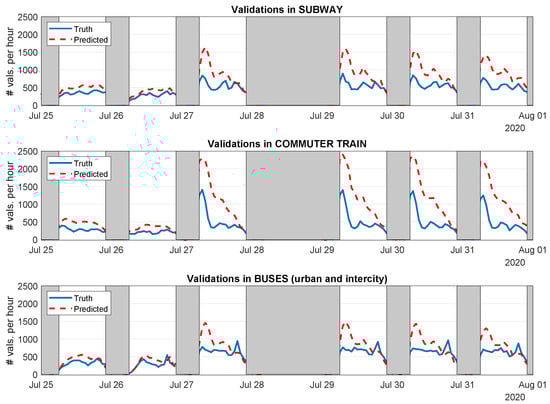 Figure 6h. The afternoon peak almost disappears in the second scenario, which reflects that this maximum is related with leisure activities and recreational trips that were canceled during the state-of-alarm situation. Finally, we observe that the shape of weekend and holiday daily public transport patterns in pre- and post-pandemic scenarios,