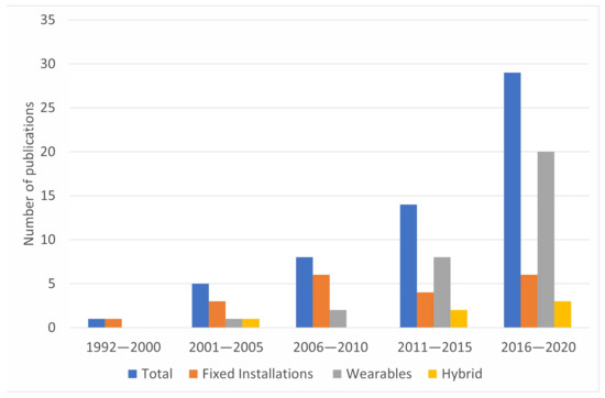 According to the literature reviewed in Table 2, Table 3 and Table 4, HMPs have evolved consistently during the last three decades. Although first ideas focused on fixed installations such as haptic chairs, it is clear that the tendency has been towards wearable technologies; about 54% of the total of publications corresponds to HMP-WDs with about 64% of them published in the last 5 years.