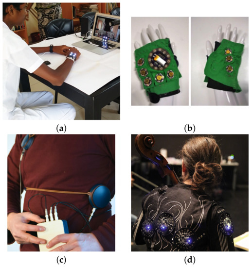 The notion of wearability of HMPs was considered by Gunther in 2001 in his proposed vibrotactile compositional tool “Skinscape” [27]. Although the idea was not implemented, it evolved to a wearable whole body musical haptic interface presented in 2003 by Gunther and O’Modhrain [15]. Nevertheless, in 2018, Turchet [58] introduced the concept of musical haptic wearables for audiences or MHWAs, where vibrotactile feedback was transmitted via haptic garments that members of an audience could wear. In this review, the concept of HMP-WDs is proposed to generalize its implementation not only for listening experiences but also as SSSs for hearing impaired individuals. Even though Turchet describes basic requirements of MHWAs, such as embedded intelligence and wireless connectivity, some prototypes needed desktop installations because of the research stage at which the projects were, such as Gunther’s “Cutaneous grooves” whole body haptic interface, while others are musical haptic wearables intended for experimentation purposes only. Consequently, most works described in this section are not necessarily portable at the moment of publication, but have clear opportunities to lately become HMP-WDs. Starting from prototypes that cover a small skin surface, there are bracelets (Figure 4a), designed to be worn on the wrist (see, e.g., in [19,21,59,60]); gloves and mobile device mockups (Figure 4b), designed to be worn or held on the hands (see, e.g., in [37,61,62,63,64]); belts (Figure 4c), designed to be worn surrounding the body from the chest to the abdomen (see, e.g., in [8,35,41,42]); and jackets (Figure 4d), designed to be worn on the upper body with actuators usually located on the back, the front and the superior limbs (e.g., [38,65]). Other variations are whole body suits [15], and headphone type displays [39], but instances are scarce. As well as for HMP-Is, design of HMP-WDs requires consideration of frequency perception thresholds according to the part of the body where the device will be attached. Auditory feedback may be provided with almost no effect on portability but if adding visual feedback the user would be constrained to a reduced space, such as virtual reality (VR) or augmented reality (AR) installations. For effective portability, special attention must be focused on energy consumption to extend at maximum battery lifetime. Strategies such as pulse-width modulation (PWM) for efficient signal rendering may be combined with lightweight efficient actuators such as DMAs; although resulting increased noise should be assessed [36]. Additionally, if it is expected that the user wears the HMP, the appearance and user interface capabilities of the device are relevant and should be considered, as they are in [35,42,65]. Finally, bone and airborne conduction should be considered for high frequency-energy vibrations or when HMP-WDs are attached near the head or internal organs, as may influence vibrotactile perception. Belts and jackets are of particular consideration as they cover larger areas. Alternatively, Yamazaki et al. [42] showed that larger areas of the body may be covered using strings attached to vibrating motors instead of using the motors themselves to convey the vibrotactile stimuli. This is an innovative implementation that results in better transmission of low frequency vibrations than that obtained with linear actuators. Nevertheless, additional psychophysical exploration would be necessary considering tactile rendering of more specific musical features and the BRTF. Table 3 shows a systematic overview of research on HMP-WDs.