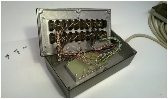 Thermocouples are connected via thermocouple connectors. To achieve a good thermal contact, the reference junctions for the thermocouples are mounted with the aid of heat conductive glue in holes drilled in the aluminum block. The reference temperature sensor is also mounted in the block. Here we used a precision thermistor of type PR103J2 with an accuracy of ±0.05 K (Littelfuse Inc. 8755 West Higgins Road Suite 500, Chicago, IL, USA). The aluminum block, which measures approximately 80 × 40 × 15 mm3, is mounted thermally insulated from the outer box by a polystyrene foam slab to minimize temperature influence from the box and its surroundings. See Figure 4.