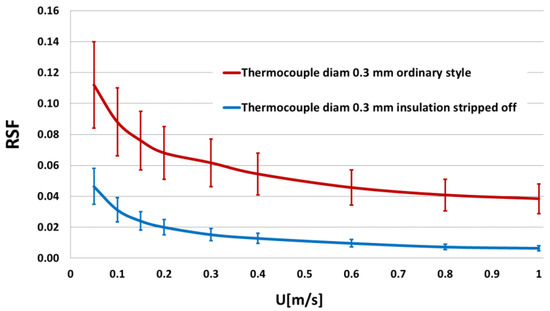 Figure 6. Radiation sensitivity factor for 0.3 mm thermocouple of ordinary style (red curve) and with stripped leads (blue curve) for different air velocities. The bars show the variation in data related to airflow direction: low bar ends = flow perpendicular to the sensor, high bar ends = flow along with the sensor. (Data from [14]).