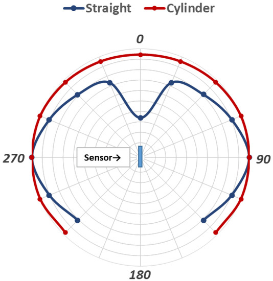 Figure 7. Relative heat convection for different airflow directions for straight (blue) and coiled (red) sensors. Zero degrees = flow head-on.
