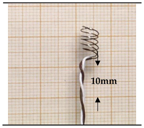 The flow direction may not be easily identified for low velocities indoors, and a more uniform convection heat transfer would be beneficial. This can be achieved by changing the shape of the sensor. For example, wrapping the stripped part of the thermocouple leads in the form of a coil, as shown in Figure 8, considerably decreases direction sensitivity. Measured values are shown in the red curve in Figure 7. Note that the curves in Figure 7 show relative sensitivities related to the 90-degree values.