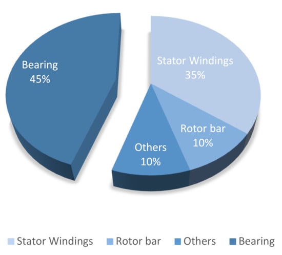 While there are several sources that can cause the failure of electrical machines, the failures themselves can be classified into two main categories of internal or external depending on the location of the fault source. The causes of internal source failures are manufacturing errors and material deterioration, whereas external faults are caused by interaction with the operational environment, power supply, and load. The internal and external source failures can be roughly split into subcategories such as mechanical, electrical, or environmental, and then into more specific faults types such as rotor strikes, dielectric failure, eccentricity, unbalanced voltage, and poor mounting [6]. The diagram summarizing the components where industrial electric motor faults occur and the occurrence frequency fractions according to reliability studies is presented in Figure 1 [7].