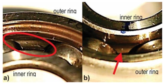 Examples of bearing damage visual representation: (a) Indentation at the raceway of the outer ring; (b) Small pitting at the raceway of the inner ring.
