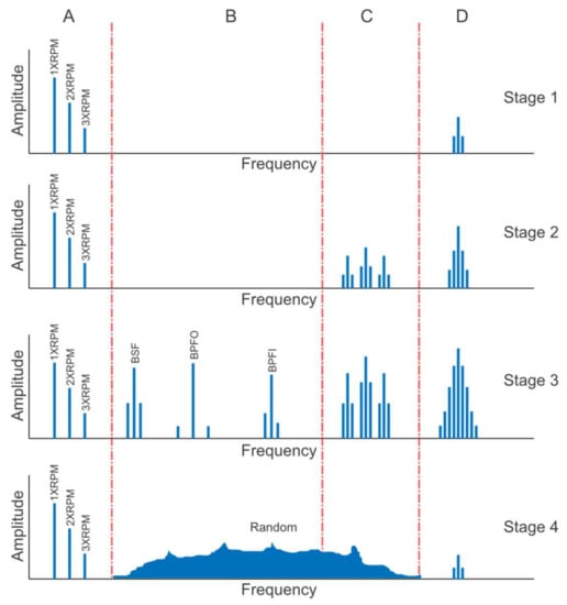 There are four stages of bearing fault evolution. Every stage is defined by a frequency range and contents. In Figure 3, the bearing vibration frequency spectrum is divided into four ranges. A is the range where the normal components related to speed are present, B is a fundamental bearing fault frequency range, C is a range of bearing natural frequencies, and D is a range for bearing high frequencies.