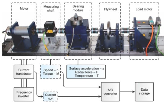 In this work, the dataset was obtained from the KAt-DataCenter of the Chair of Design and Drive Technology, Paderborn University, Germany [41]. Vibration data in this dataset are collected from the modular test rig shown in Figure 4. The test rig consists of an electric motor, measuring shaft, bearing module, a flywheel, and a load motor. Inside the bearing module, ball bearings with different kinds of damage are mounted for experimental data generation. The electric motor is PMSM type with nominal power of 425 W (Type SD4CDu8S-009, Hanning Elektro-Werke GmbH & Co. KG), which is operated by a standard industrial inverter with a switching frequency of 16 kHz (KEB Combivert 07F5E 1D-2B0A).